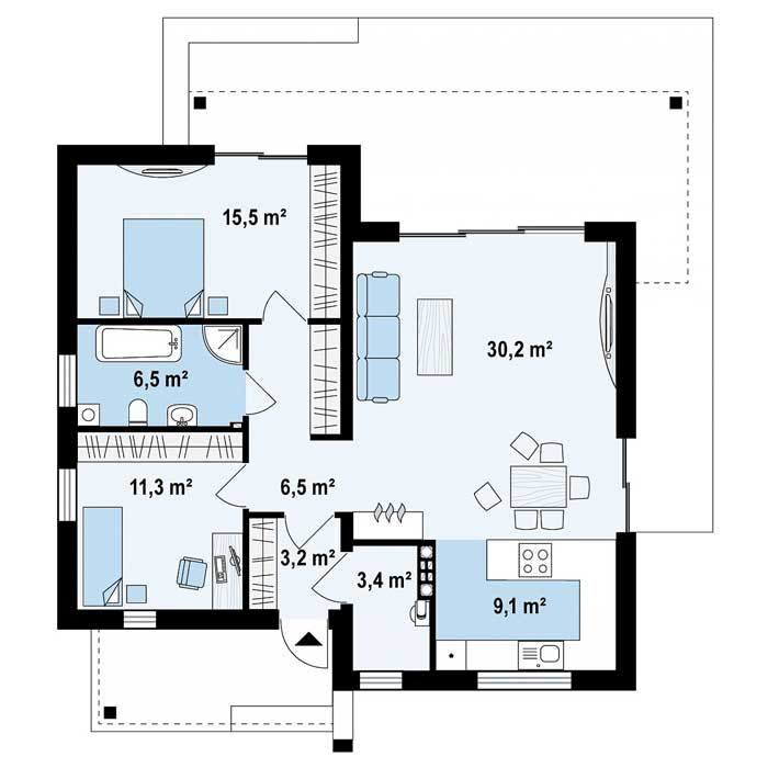Жилой дом из газобетона «Мальта» 1,490,000 ₽ Небольшой дом из газобетона Мальта в стиле хай-тек — элегантный, практичный и экономичный – для любителей строгих линий и практичных решений Общая S=86,1 m2